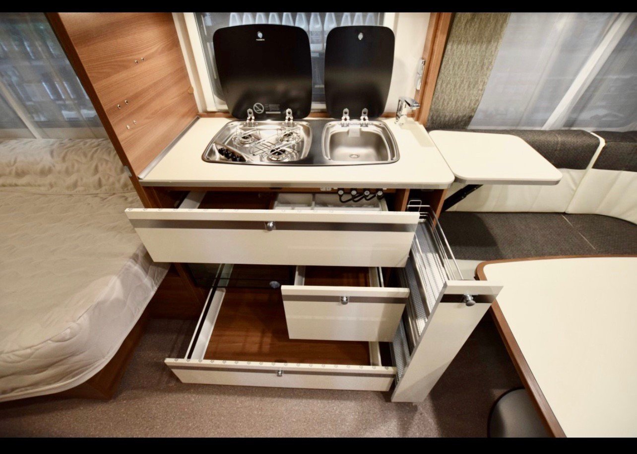 Tôles latérales lisses et rebords aluminium, moquette de lit, moquette de sol, tableau de commande 12V, extincteur, rallonge de plan de cuisine, éclairage indirect, porte d’entrée avec fenêtre et porte moustiquaire, Softclose sur trappes de placards de pavillon