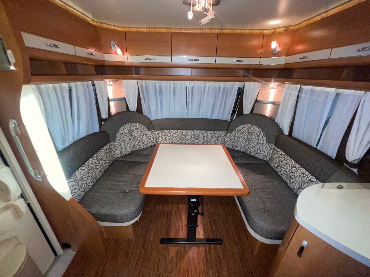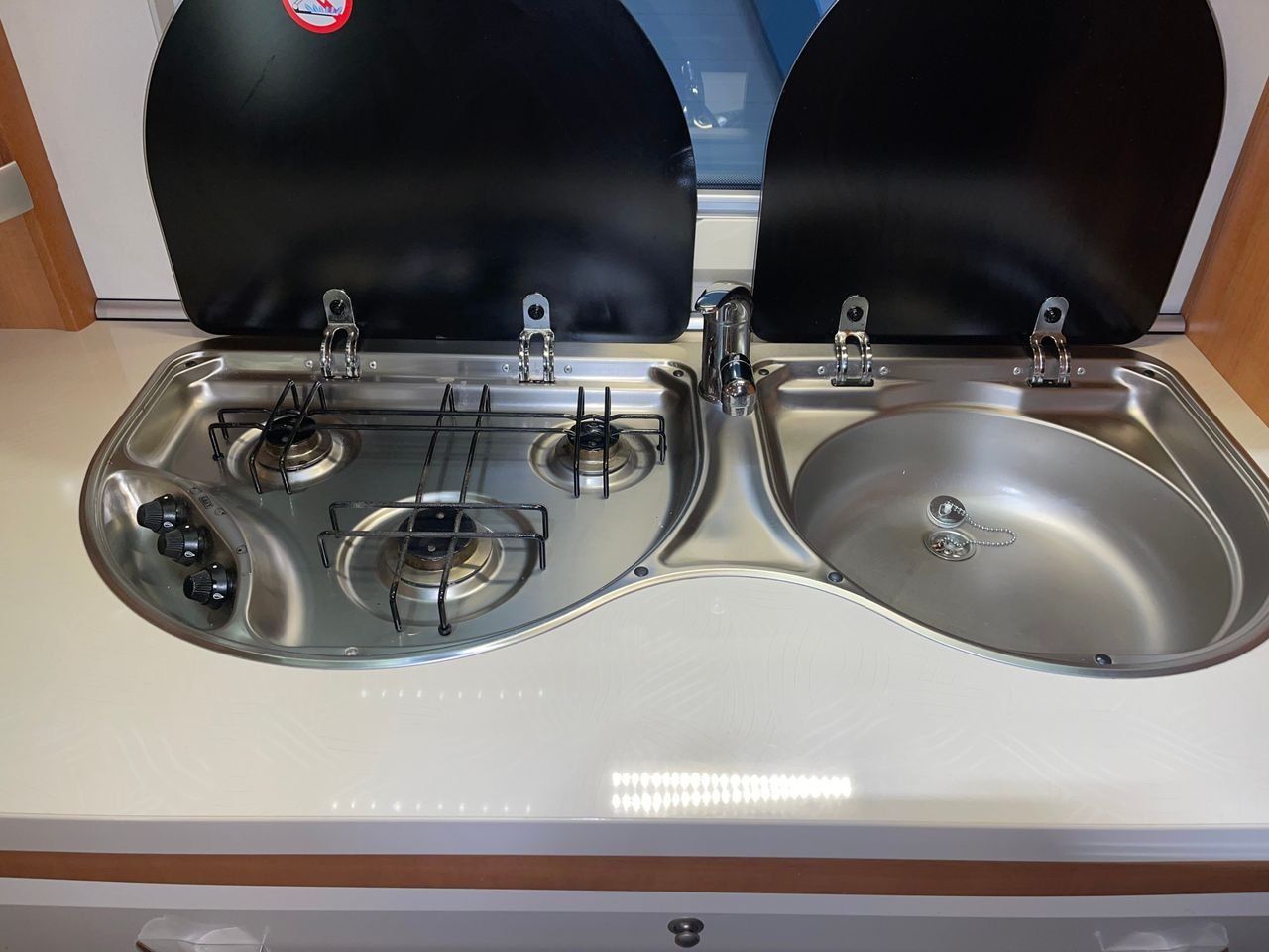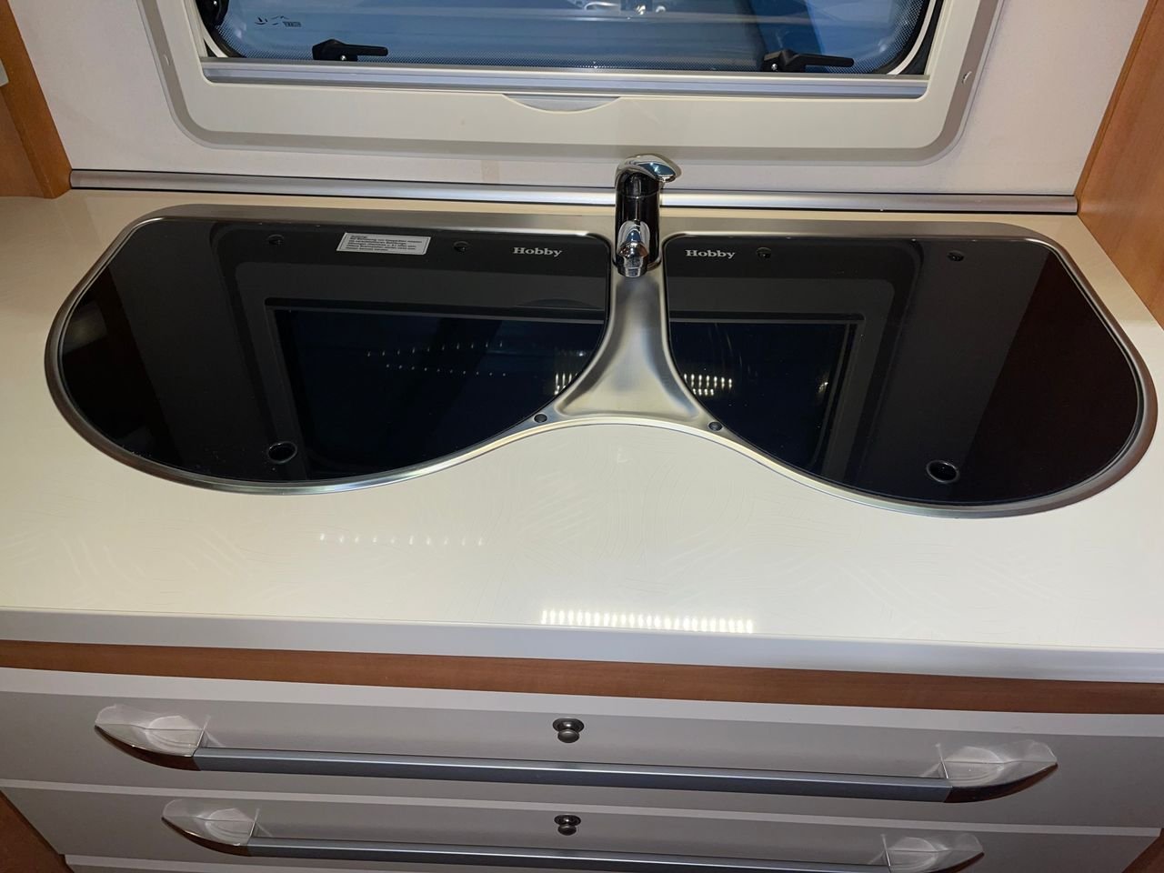 Magnifique Hobby 560 Prestige, Grand et joli carré à l’arrière de la caravane. Cuisine spacieuse avec grands tiroirs. La cuisine est équipée de 3 plaques chauffantes, de liquide vaisselle et d’un hotte. Grand réfrigérateur.