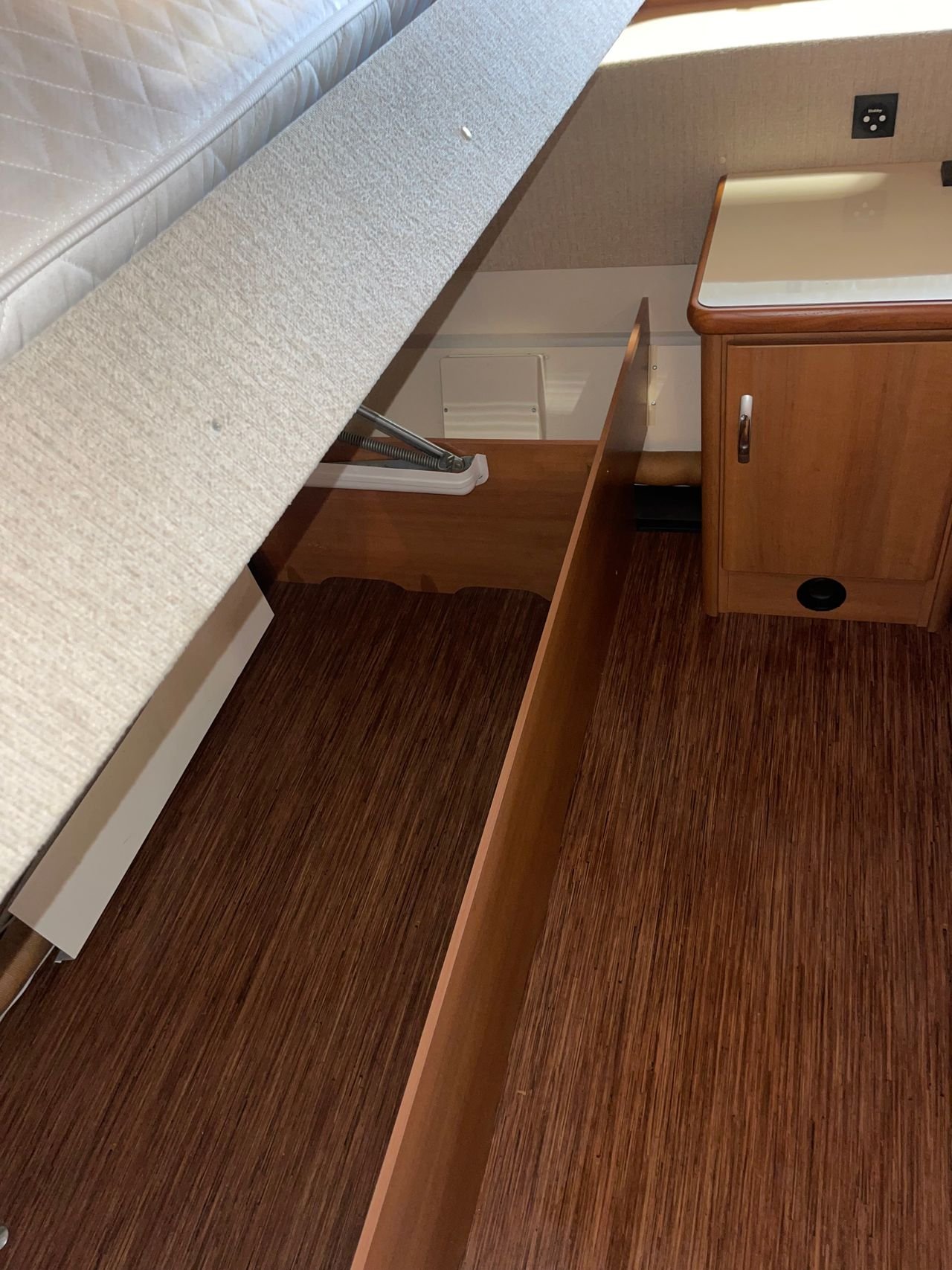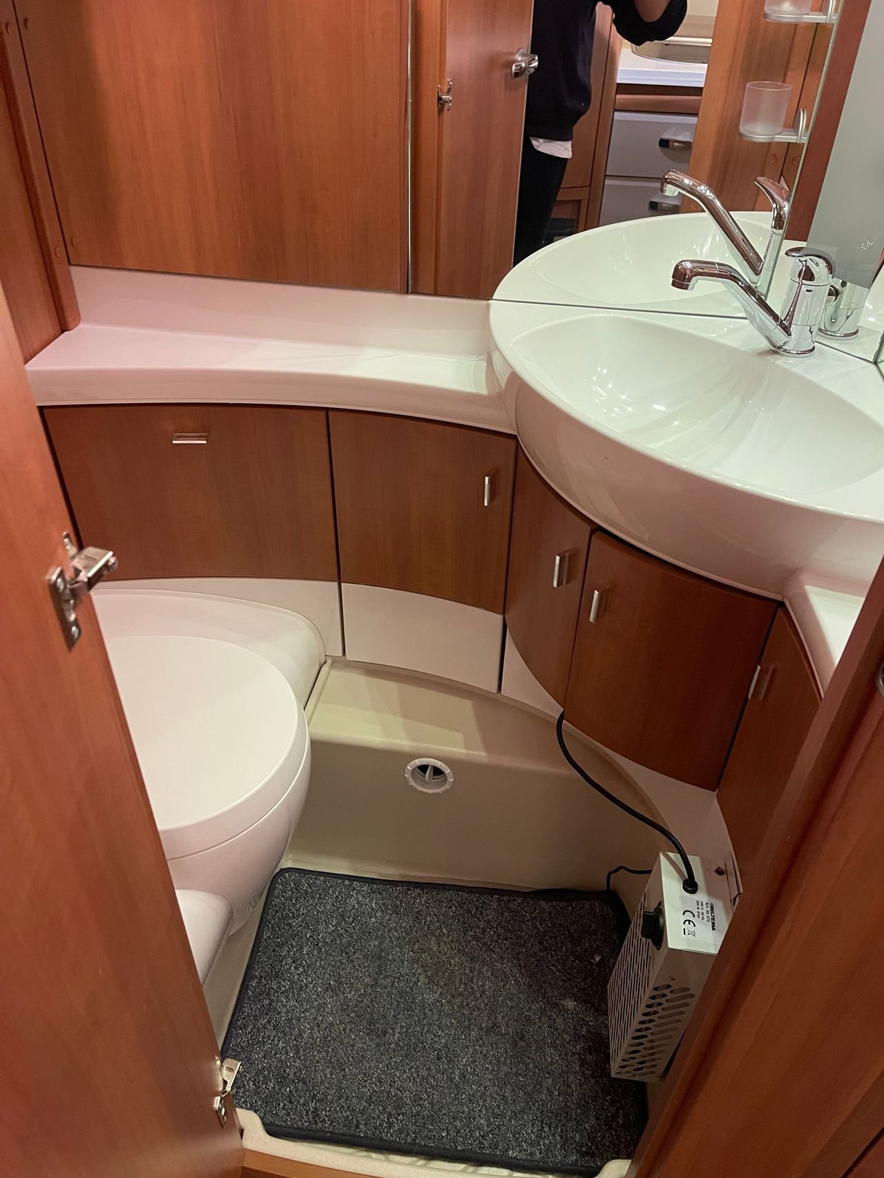A l’avant de la caravane se trouvent 2 lits simples avec une table de chevet au milieu. Salle de toilettes séparée avec lavabo et toilettes. Beaucoup d’espace de rangement.